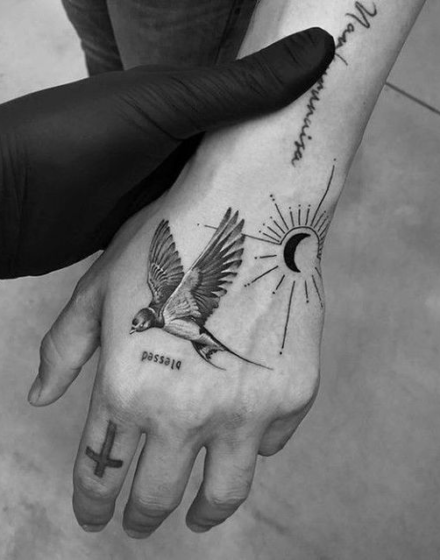 The swallow is often associated with hope. Many users put such tattoos on their hands to always remember that after a dark streak in life comes a bright one.