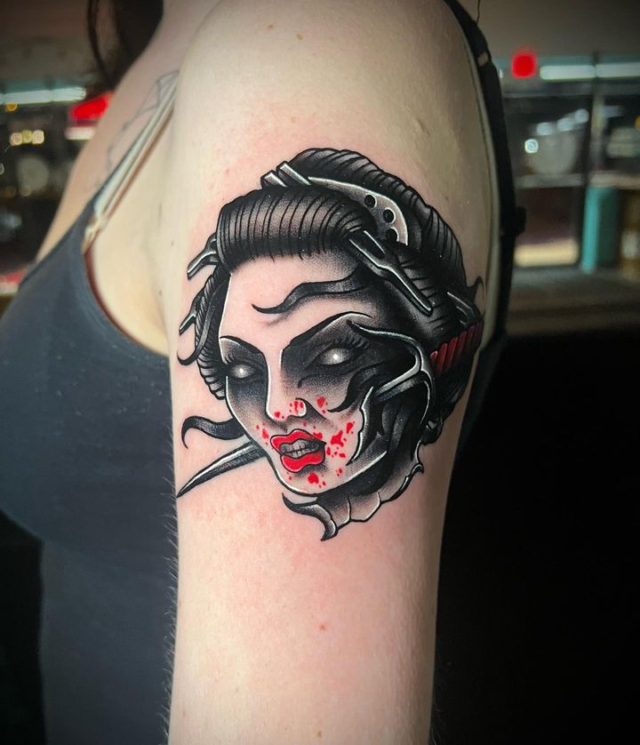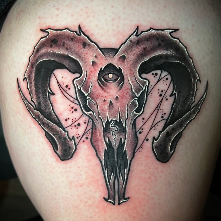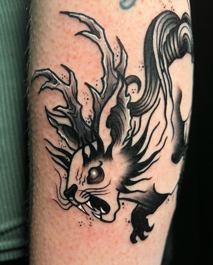 Collie Vas is a tattooer from Austin, Texas. The artist works in black and grey and blackwork styles and enjoys adding gothic details. You can find Collie at Atomic Tattoo – Research & Duval Studio.